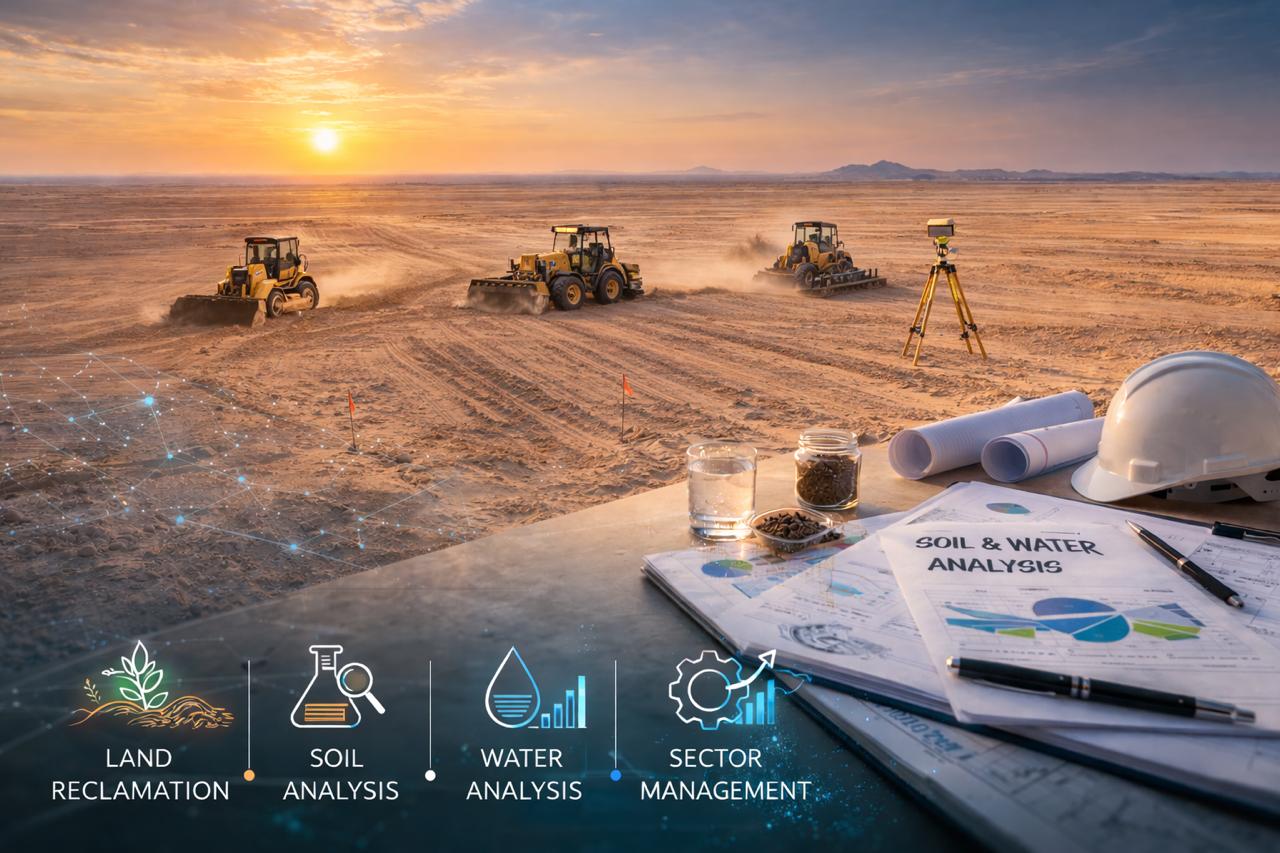 الدراسات والتحاليل الزراعية، تقييم الجاهزية الفنية للأرض، تطوير البنية الأساسية للمياه والطاقة والري، وتهيئة المشروع لبدء التشغيل الزراعي ضمن مراحل تنفيذ مدروسة.